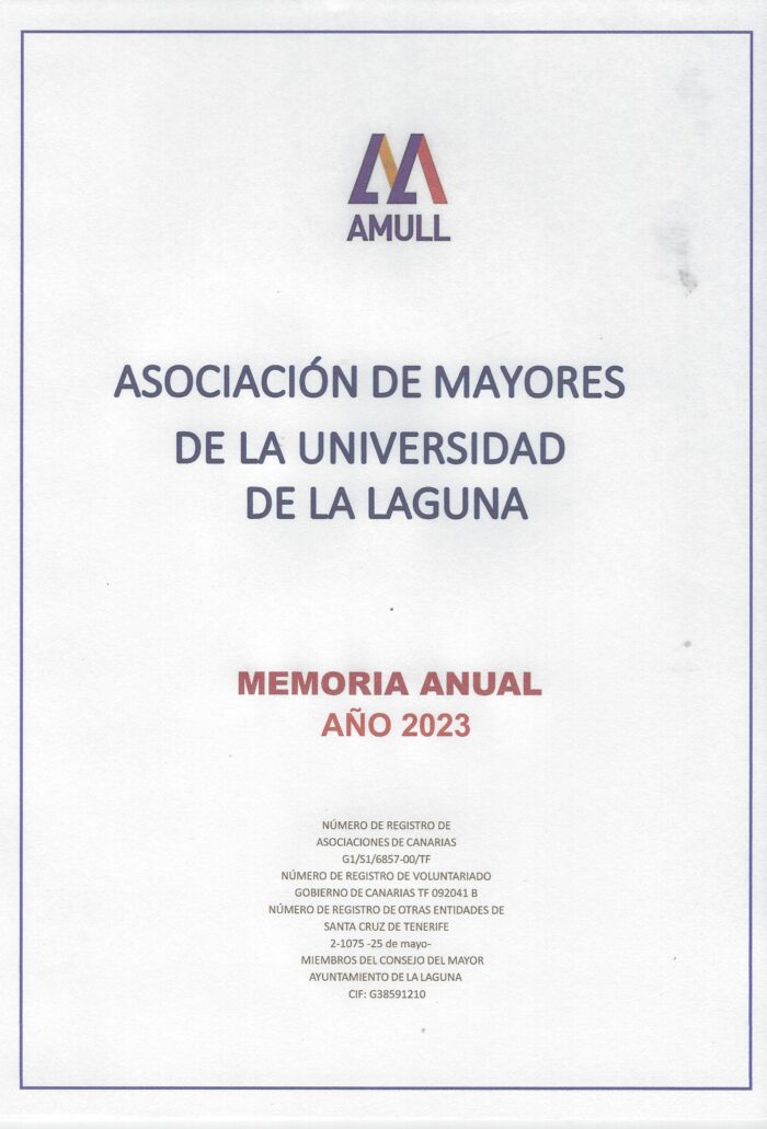 Memoria Anual de la Asociación de Mayores de la Universidad de La Laguna del año 2023 que recoge las actividades de esta asociación en ese año. MEMORIA ANUAL AMULL