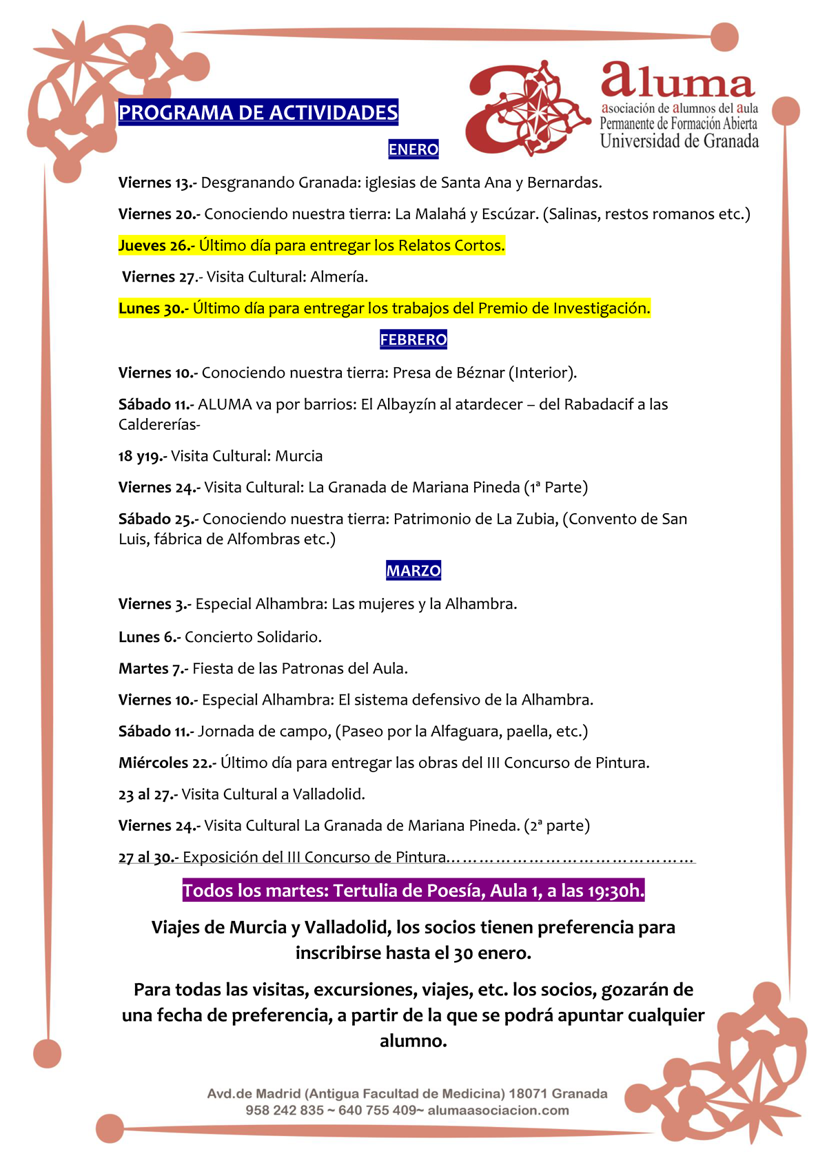 ALUMA, Programa de Actividades Artículos relacionadosCuéntame tu soledad11/01/2024Observatorio del edadismo11/01/2024Celebrada la gala de entrega de los XIV Premios SENDA11/01/2024Conclusiones de las XXI Jornadas Internacionales sobre Asociacionismo en los PUM10/10/2023Crónica de las XXI Jornadas Internacionales sobre Asociacionismo en los PUM10/10/2023La Mesa Estatal por los derechos de las personas mayores10/10/2023Conferencia de Alto Nivel sobre Envejecimiento10/10/2023Pre-programa · XXI Jornadas Internacionales sobre Asociacionismo en los Programas Universitarios de Mayores29/06/202310º Aniversario Foro LideA29/06/2023Día Mundial de Toma de Conciencia de Abuso y Maltrato en la Vejez29/06/2023ERASMUS para universitarios mayores29/06/2023Conclusiones XI congreso nacional de organizaciones de mayores29/06/2023CAUMAS presente en el XI CONGRESO de CEOMA28/06/2023Austria. La directora Susanne Ring nos presenta la Uni. 55 plus, Salzburgo15/04/2023Reunión de presidentes de las Asociaciones que componen CAUMAS15/04/2023Pre-programa XXI Jornadas Internacionales sobre asociacionismo en los Programas Universitarios de Mayores15/04/2023Entrega de los diplomas del Programa Interuniversitario para mayores de 55 años15/04/2023Endesa se reúne con el Comité Asesor de 65YMÁS para conocer las necesidades de los sénior15/04/2023X Aniversario Foro LIDEA15/04/2023Resumen previo de la 13ª reunión del grupo de composición abierto de Naciones Unidas14/04/2023Mayores se declaran en “emergencia climática”, en el marco del ‘XI Congreso Nacional de Organizaciones de Mayores’14/04/2023Los universitarios mayores investigan08/01/2023Ley de cultura inclusiva y accesible de Galicia08/01/2023México lindo y querido. Viaje universitario (Parte II)08/01/2023Encuentro en la Universidad Autónoma de Ciudad de México (Parte I)08/01/2023Formación y Cultura a lo largo de toda la vida, claves para un envejecimiento activo y saludable08/01/2023XI Congreso Nacional de Organizaciones de Mayores08/01/2023Los XIII Premios Senda08/01/2023Conferencia iLearn 5007/01/2023La Universidad de Mayores Abierta al Futuro28/10/2022Constitución del Consejo Estatal de Personas Mayores28/10/2022Tercera edición de la Semana Europea Online del Envejecimiento Activo y Saludable28/10/2022Tercera edición de la Semana Europea Online del Envejecimiento Activo y Saludable28/10/2022Ceuta acoge el primer Encuentro Interprovincial del Aula Permanente (tras la pandemia)09/07/2022Renovación de la Junta Directiva de CAUMAS09/07/2022Asamblea General Ordinaria y Extraordinaria de CAUMAS09/07/2022ALUMA · XX Jornadas Internacionales sobre Asociacionismo en los PUM09/07/2022LA PRESIDENTA DE CAUMAS CON EL MINISTRO DE CULTURA Y DEPORTE05/04/2022LA MESA ESTATAL FELICITA AL SENADO05/04/2022Reunión de la Presidenta de CAUMAS con la asociación del alto Guadalquivir de la universidad de Jaén y ALUMA03/01/2022CAUMAS, en el Congreso Internacional de Sociología de Valdepeñas, celebrado los días 19, 20 y 21 de noviembre03/01/2022Reflexiones y aprendizajes en tiempos de pandemia desde la promoción de la salud03/01/202212 factores básicos para el fomento y mejora de la calidad de vida de las personas mayores03/01/2022Tratado de la Organización Mundial de la Salud sobre la preparación y la respuesta ante una pandemia03/01/2022Constitución de la Plataforma de Mayores y Pensionistas (PMP)03/01/2022CEOMA, Preparando el Futuro con motivo del ‘Día Internacional de las Personas Mayores’14/10/2021El Aula de Mayores + 55 de la Universidad de Málaga incorpora el espacio de la Térmica14/10/2021Las personas mayores en el Foro Político de Alto Nivel sobre desarrollo sostenible 202114/10/2021Manifiesto a favor de la creación de una convención internacional sobre los derechos de las personas mayores13/10/2021XXV Aniversario Unión Europea de Mayores13/10/2021Entrevista a Dña. Mª José Moure Rodríguez Directora de la Escuela Abierta de Formación Permanente (EAFP) de la Universidad de Vigo13/07/2021Jornada sobre la vejez22/06/2021XIX Jornadas Internacionales sobre Asociacionismo en los PUM, CONCLUSIONES22/06/2021#MayoresActivosEnCasa ganadora de los Premios de Internet 2021.22/06/2021«Arqus, la macro Universidad que tiende puentes en Europa»22/06/2021Evitar la discriminación de las personas mayores es misión de todos22/06/2021XIX Jornadas Internacionales sobre Asociacionismo en los PUM, 9 de abril de 2021, online22/06/2021XIX Jornadas Internacionales sobre Asociacionismo en los PUM30/03/2021La “Revolución de la longevidad” llega al senado pidiendo reformas urgentes en los cuidados30/03/2021La SEGG plantea la transformación social del envejecimiento en el senado30/03/2021