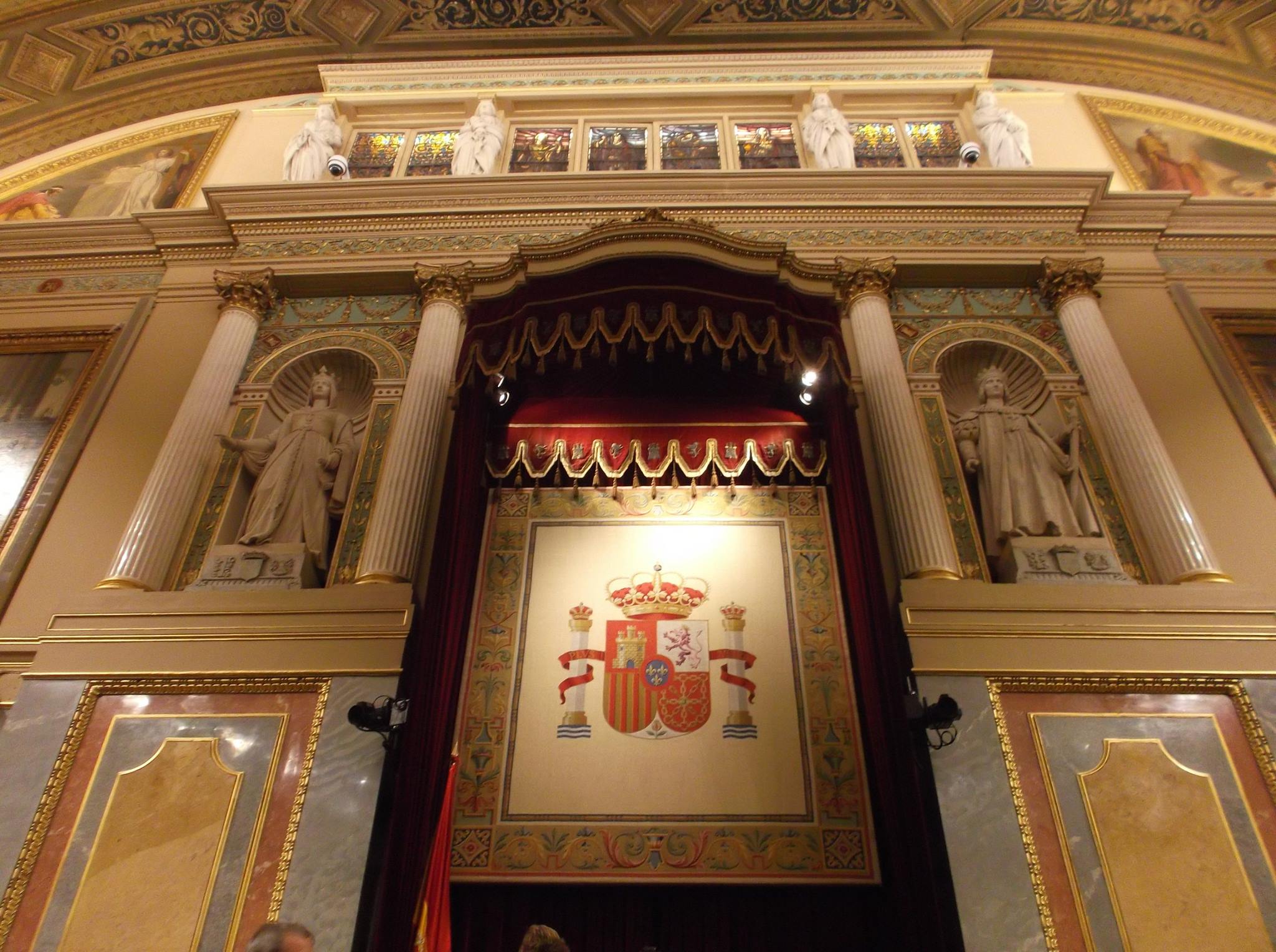 El motivo de elegir el Congreso de los Diputados para la visita a Madrid tenía sus antecedentes. El Diputado por A Coruña, D. Juan de Dios Ruano, que fue profesor de Sociología en nuestra Universidad Senior se había ofrecido para mostrarnos las dependencias del Congreso durante su mandato, en cualquier ocasión que nos desplazáramos a Madrid. El viernes día 22 de mayo fue el asignado. A las 11, 30 nos esperaba el Diputado para la visita, acompañándonos y mostrándonos no solo el hemiciclo de las sesiones plenarias del Congreso sino también muchas de las dependencias, sala de conferencias, de comisiones, la biblioteca, etc. Iba explicándonos el destino y función de las diferentes salas e incluso simpáticas o curiosas anécdotas relacionadas con el nombre que tenían asignados o algo acontecido en ellas.