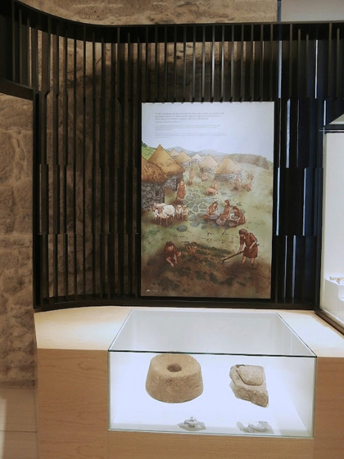 Sala 2, “Poblados y Casas Circulares”. Está centrada en la Edad del Hierro (800-60 a. C.). El hombre se hace sedentario y surgen los castros, poblados estables fortificados situados en lugares estratégicos.